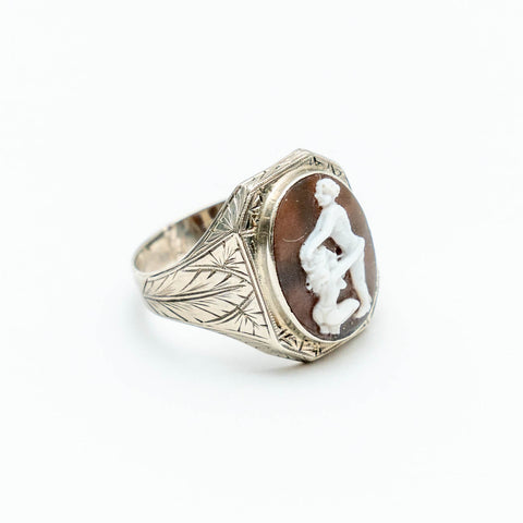 Hand Carved Sardonic Shell BJ Cameo set in Antique 14kt White Gold Signet Ring